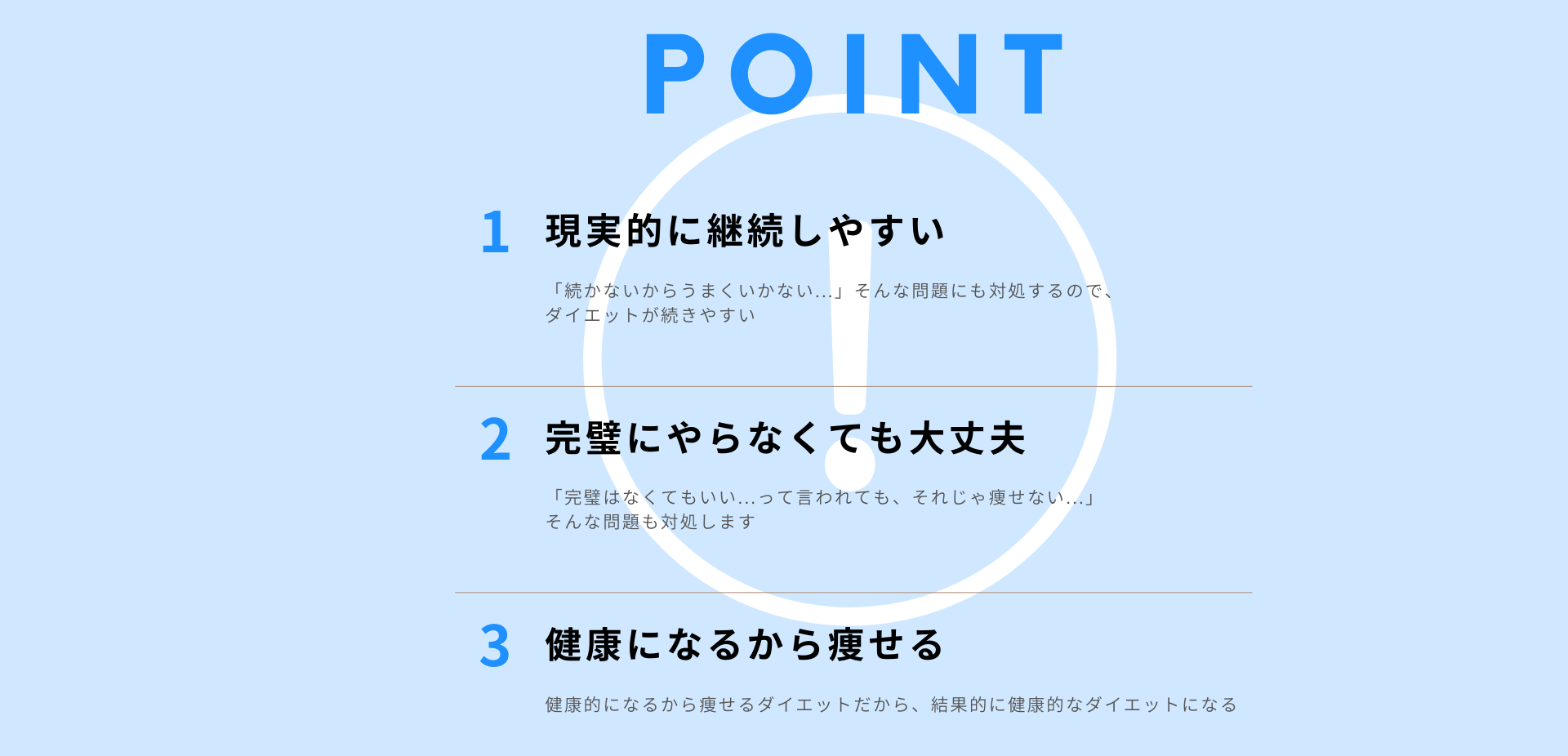 どれだけ正しいダイエットでも、続かなければ間違ったダイエットをしているのと変わりません。わかっているけどつい頑張って辛くて諦めてしまう。モチベーションを保ち続けるのはほとんど無理ゲーです。だから、MSEMメソッドでは、意志力をできるだけ使わない仕組みと回復する仕組みで健康的な体を作るダイエットを実現します。
