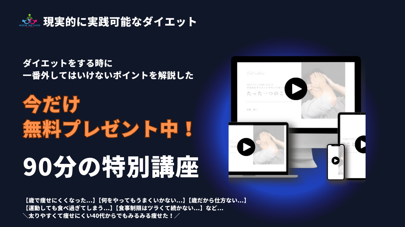 「ダイエットは完璧じゃなくてもいい」とよく言われますが、完璧にやらなければやらないほど、成果が出にくくなるのが現実です。やれていない分だけの成果が出にくくなるのは当たり前ですよね。ですから、成果を出すためには、その完璧にやれていない部分を補う方法を取り入れる必要があります。だから、MSEMメソッドでは、ダイエット効果を最大化する仕組みを身に付けて最短で長持ちするダイエットを実現します。