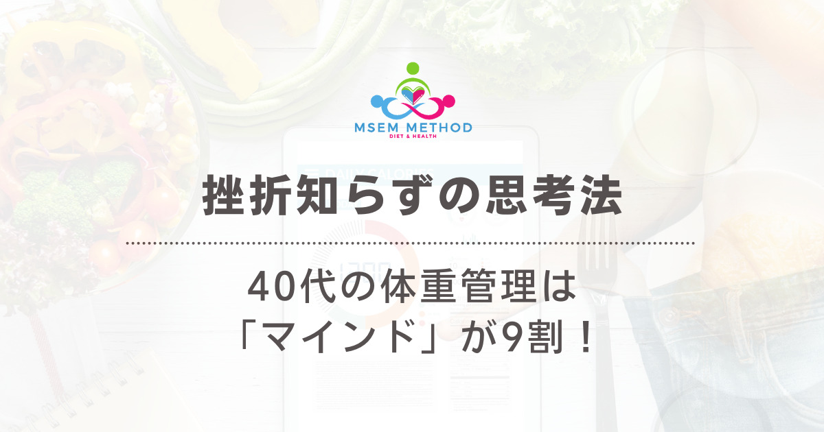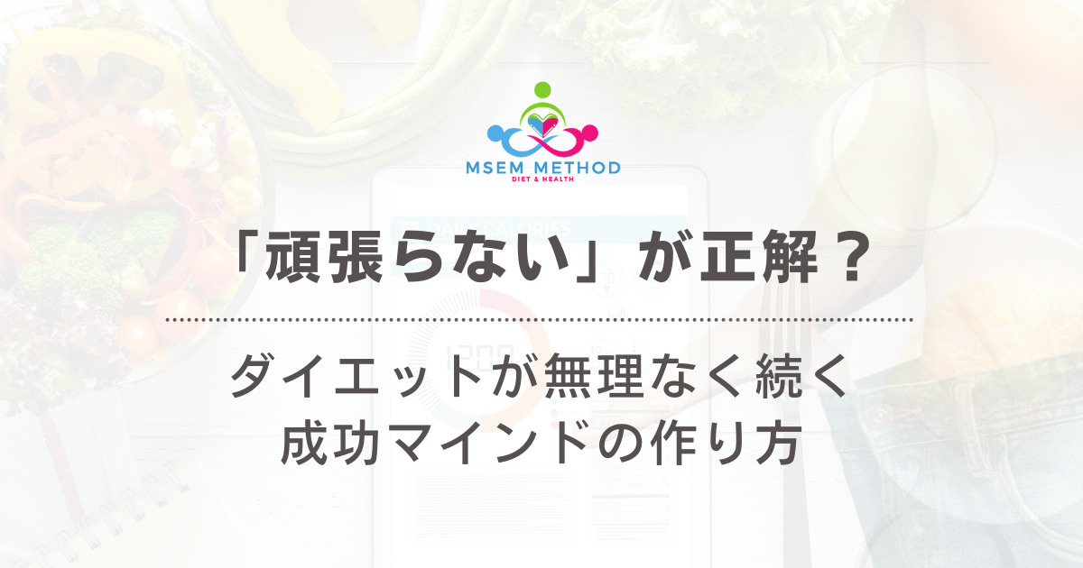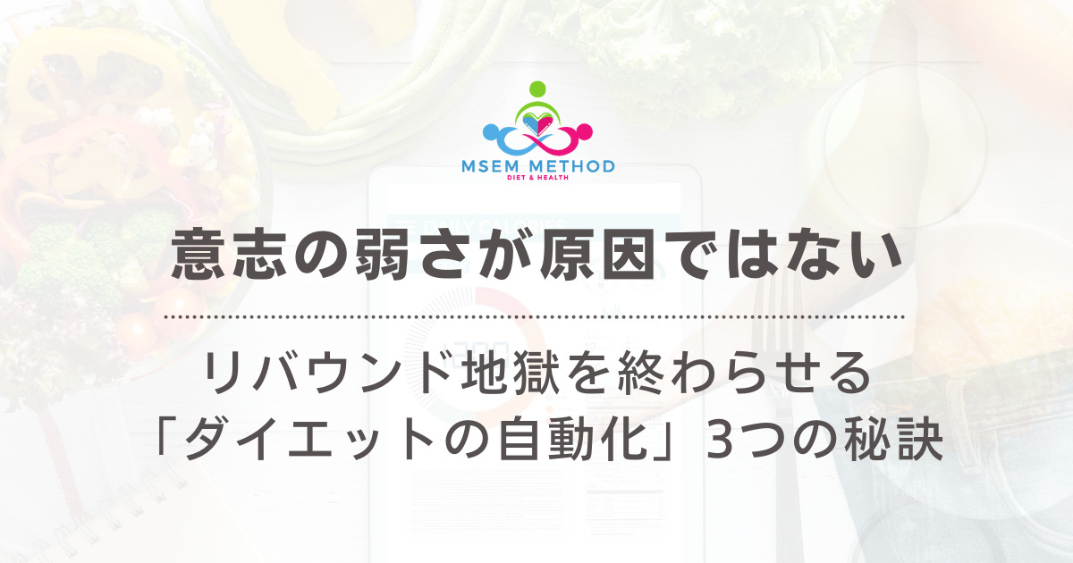どれだけ正しいダイエットでも、続かなければ間違ったダイエットをしているのと変わりません。わかっているけどつい頑張って辛くて諦めてしまう。モチベーションを保ち続けるのはほとんど無理ゲーです。だから、MSEMメソッドでは、意志力をできるだけ使わない仕組みと回復する仕組みで健康的な体を作るダイエットを実現します。