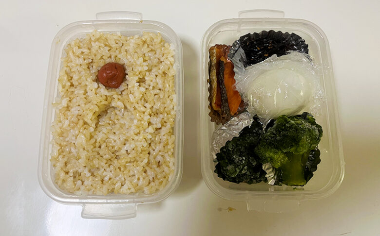玄米ご飯・ほうれん草・ブロッコリー・焼鮭・野沢菜の漬物・ゆでたまご