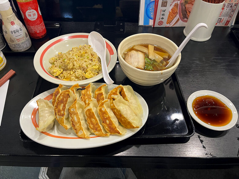 今日は、夜は餃子とチャーハンと半ラーメンのセットです。